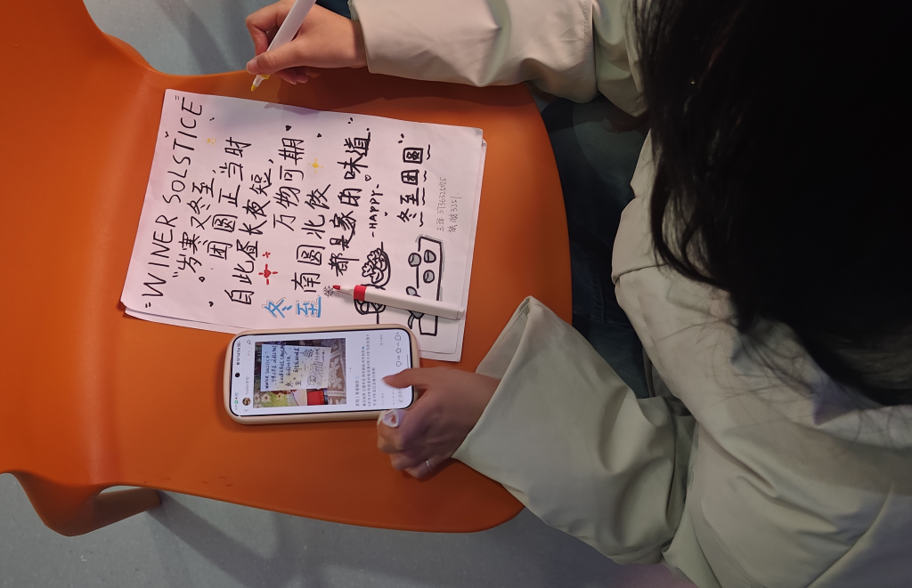 手工区则弥漫着墨香与剪纸的清脆声响,成为文化实践的生动载体。参与者们手持提前准备的纸张、彩色绘画笔等工具,沉浸式创作冬至主题作品:既有饱含节气韵味的文案书写,也有寓意吉祥的主题画作,更有同学别出心裁地将“天时人事日相催,冬至阳生春又来”等冬至诗词融入图画设计,让传统诗词与视觉艺术碰撞出别样火花,同学们的作品成为本次活动文化传承的鲜活印记。“在动手创作中,我真切感受到了冬至节气的文化内涵,这种沉浸式体验比单纯听课更有收获。”参与活动的沈骏同学如是评价。校团委徐亚伟老师表示:“传统文化的传承关键在于找到古今对话的切入点,此次活动通过‘知识输入—情感共鸣—实践输出’的闭环设计,实现了文化传承的‘年轻化表达’,让传统节气文化不再是博物馆里的标本,而是流动在血脉中的精神基因。”